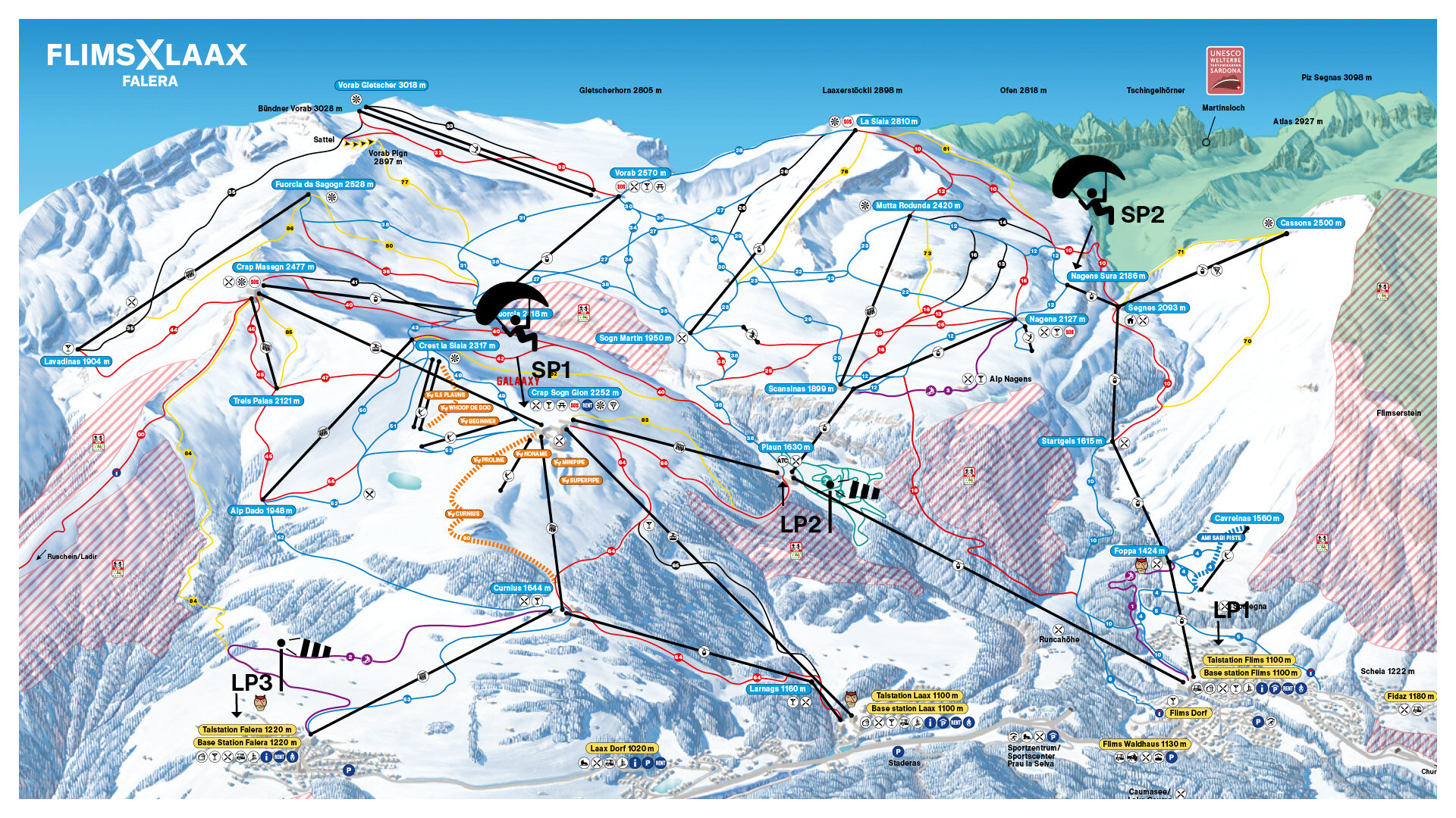 Die Destination Flims Laax bietet mehrere Start- und Landeplätze an, die einfach mit der Bergbahn erreichbar sind. Einer liegt beim Crap Sogn Gion auf 2200 m.ü.M., welcher mit der Luftseilbahnbahn von Laax Murschetg aus zu erreichen ist. Ein zweiter Startplatz befindet sich direkt bei der Bergstation Nagens Sura auf ca. 2100 m.ü.M., zu dem man mit der Goldelbahn FlemX kommt. Um die Bedingungen vor dem Abflug zu prüfen dienen als Hilfestellung die installierten Webcams und Windanlagen, welche auf der LAAX App ersichtlich sind. Für die Landeplätze stehen oberhalb von Falera sowie Flims-Dorf und auf der Ebene Plaun Zonen für die Landung zur Verfügung.